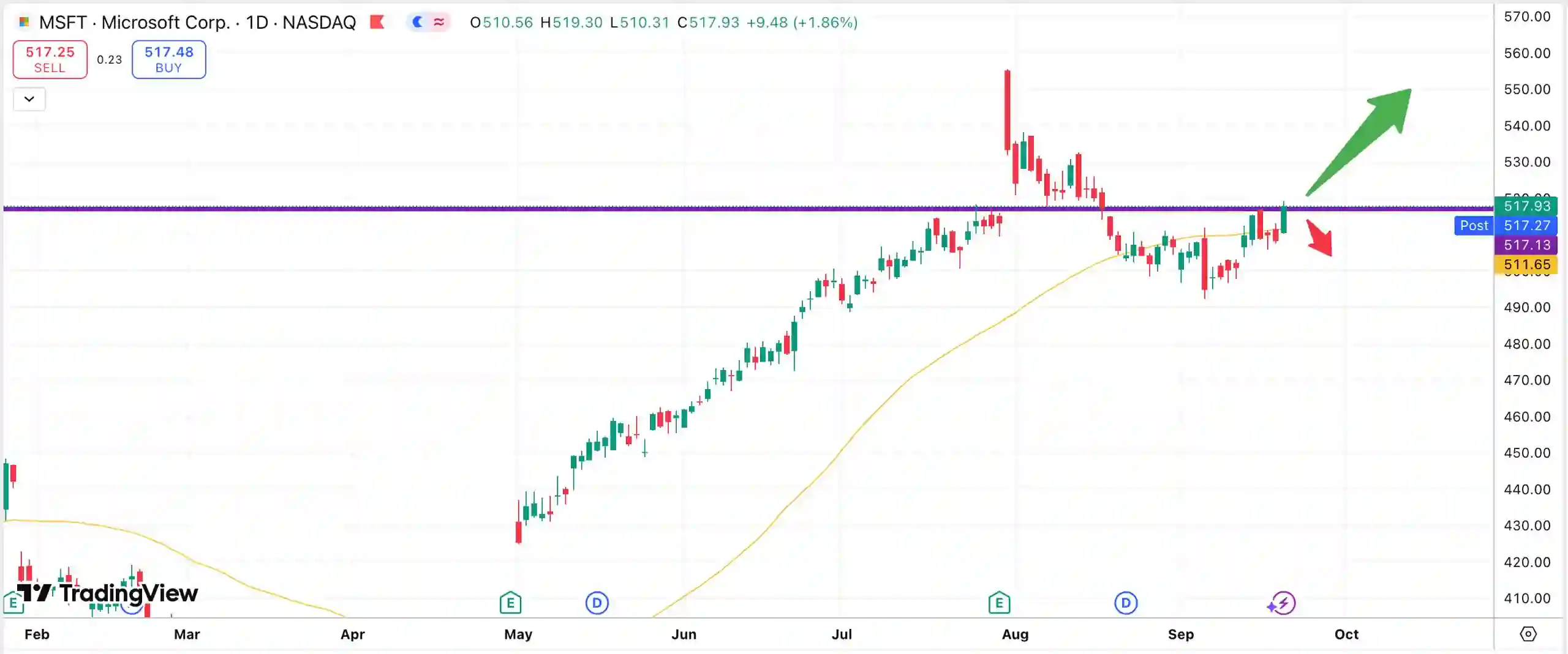 تحلیل تکنیکال سهام مایکروسافت، نبرد با مقاومت تاریخی ۵۲۰ دلاری
