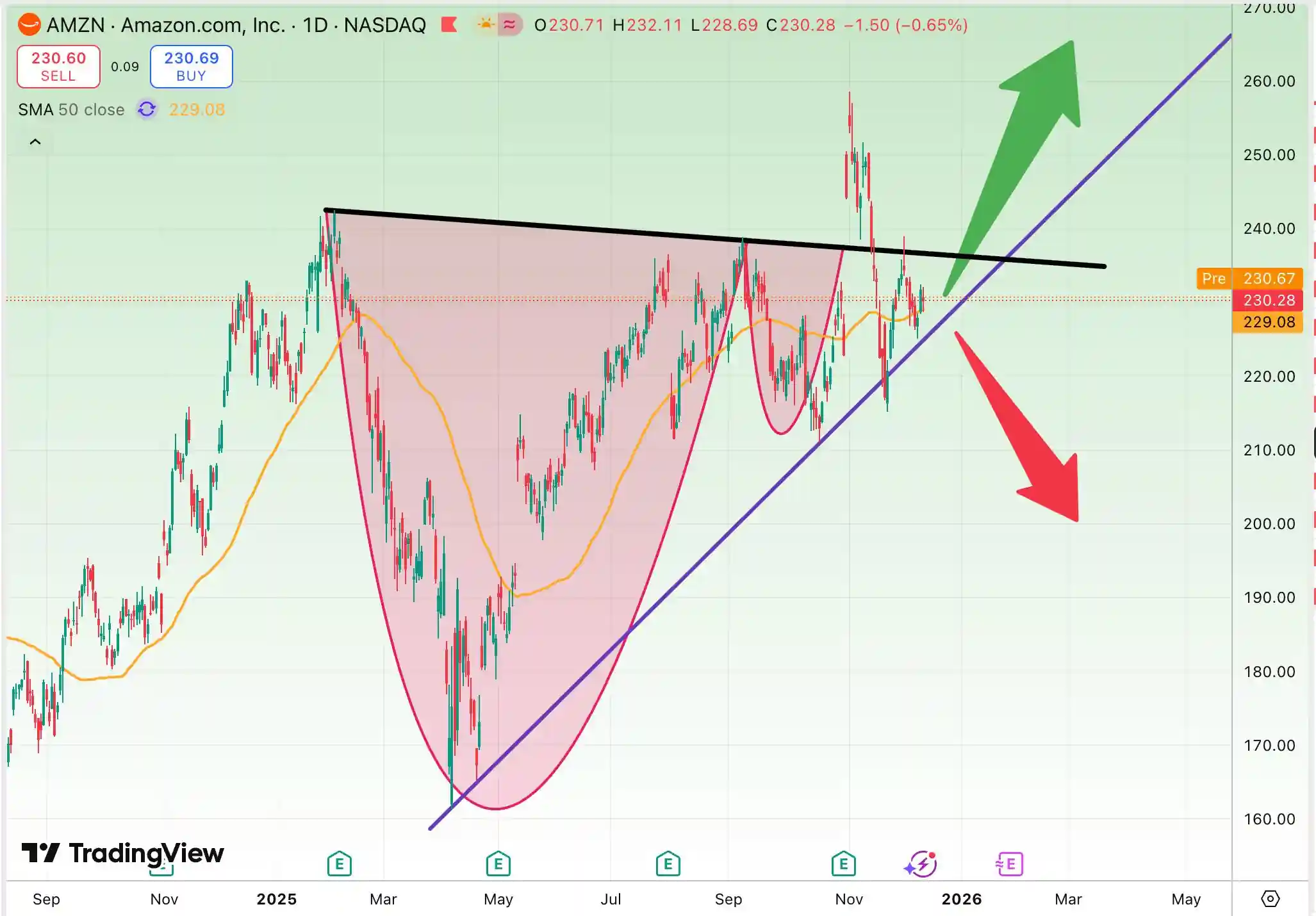 در مقابل، اگر قیمت سطح 224 دلار را به سمت پایین بشکند و تریندلاین صعودی از دست برود، سناریوی نزولی در تحلیل سهام آمازون (AMZN) فعال میشود: