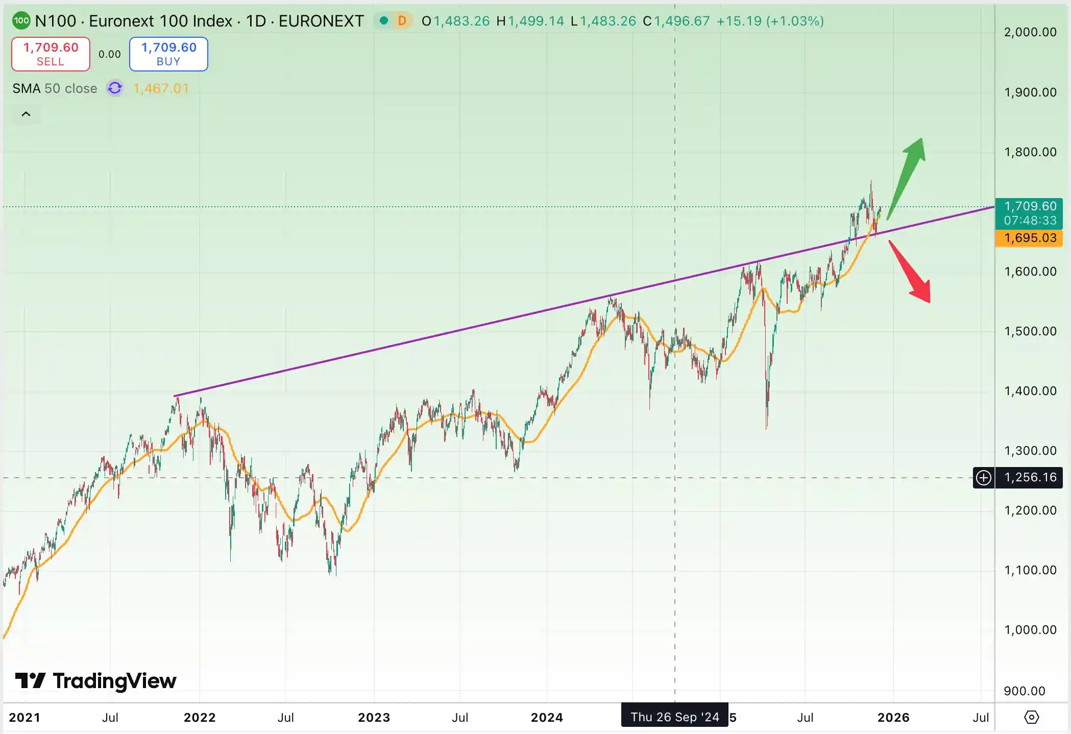 در این گزارش، تمرکز اصلی بر تحلیل شاخص Euronext و بررسی دقیق وضعیت تکنیکال و فاندامنتال شاخص N100 است؛ شاخصی که اکنون در نقطه‌ای بسیار حساس قرار گرفته است.